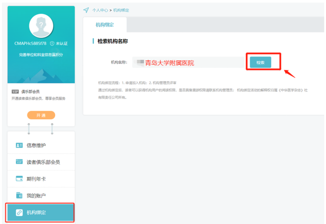 4. 个人中心中点击“机构绑定”,在机构检索框中输入“红宝石最新线路手机版”,点击“检索”。