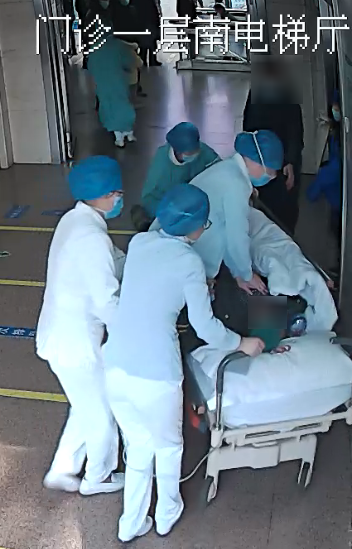 到达现场后,迅速为患者开通静脉通路、呼吸囊辅助呼吸。随后众人齐力将患者抬至担架车,共同护送着患者飞奔向急诊抢救室。因患者心跳呼吸一直未完全恢复,情况十分危急,转运过程中,急诊护士一直跪在急速移动的抢救车上,为患者进行着胸外按压。因抢救车较窄,她几次险些摔下。到达抢救室后,医护人员迅速为患者进行了气管插管。在大家的共同努力下,患者逐渐恢复了自主心跳。