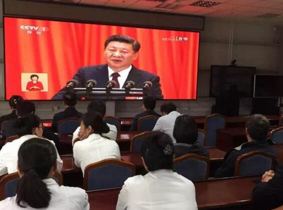 为不影响正常工作秩序,各岗位职工在工作闲暇时,分别在各科室通过网络、收音机、手机等途径收听收看了十九大开幕会。为方便全院职工收听收看,职工餐厅同步开通电视直播。