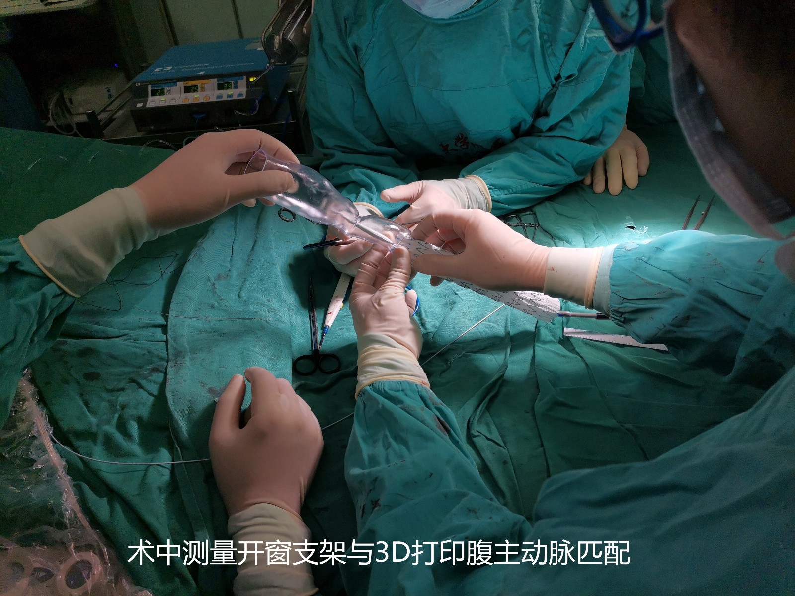 郭明金带领血管外科西海岸病区及崂山病区的团队经过精密策划、集思广益,利用先进的3D打印技术,巧妙模拟术中场景,预测一切术中可能出现的风险及并发症,反复对比不同手术方案的优缺点,对手术中的每一个细节都仔细推敲,最终确定了手术台上行“五开窗”手术:开窗手术是为了保护体内重要脏器的血液供应,把即将置入体内的覆膜支架烧灼出与体内脏器分支血管相匹配的小洞,再经右股动脉将开窗后的覆膜支架送至破口处,准确定位后释放支架,既可以使腹主动脉的分支血管对重要脏器有充足的血液供应,又可以将腹主动脉瘤体隔绝开。