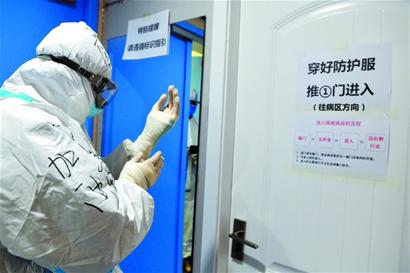 一位即将进入病房污染区的医护人员按照程序做好最后的准备